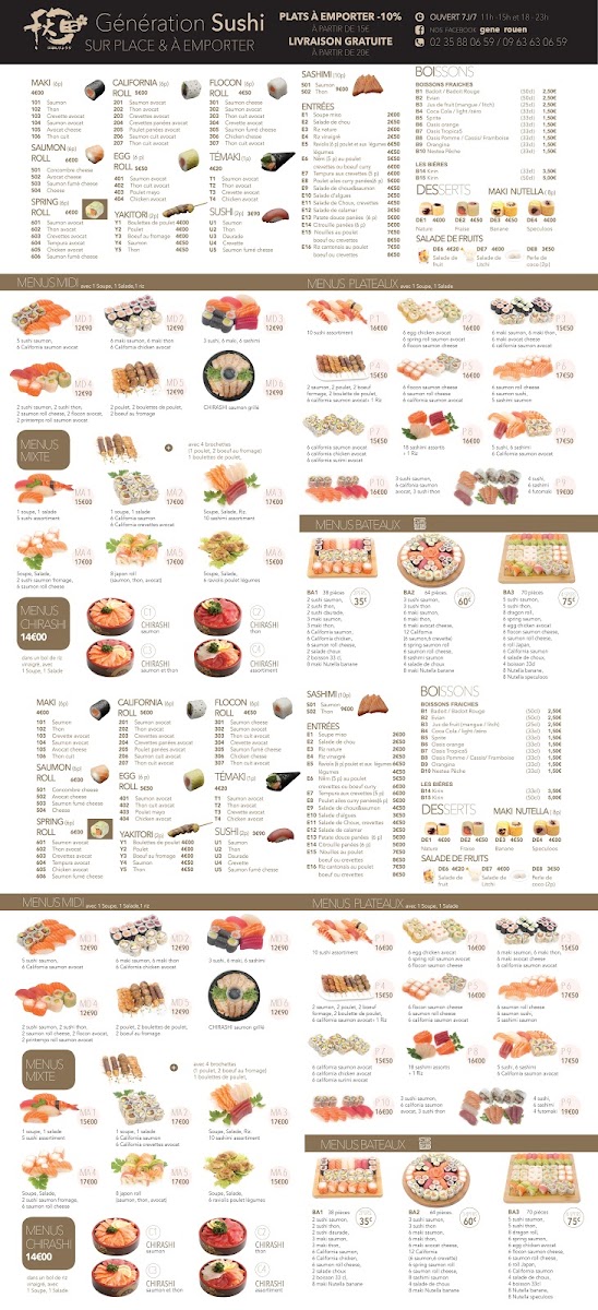 The menu at génération sushi features a variety of Japanese cuisine with a focus on sushi offerings. Visitors can expect a selection that includes traditional sushi items along with other Japanese dishes typically found in sushi restaurants. The menu is structured to accommodate different dining preferences, whether for a quick takeout order or a sit-down meal.